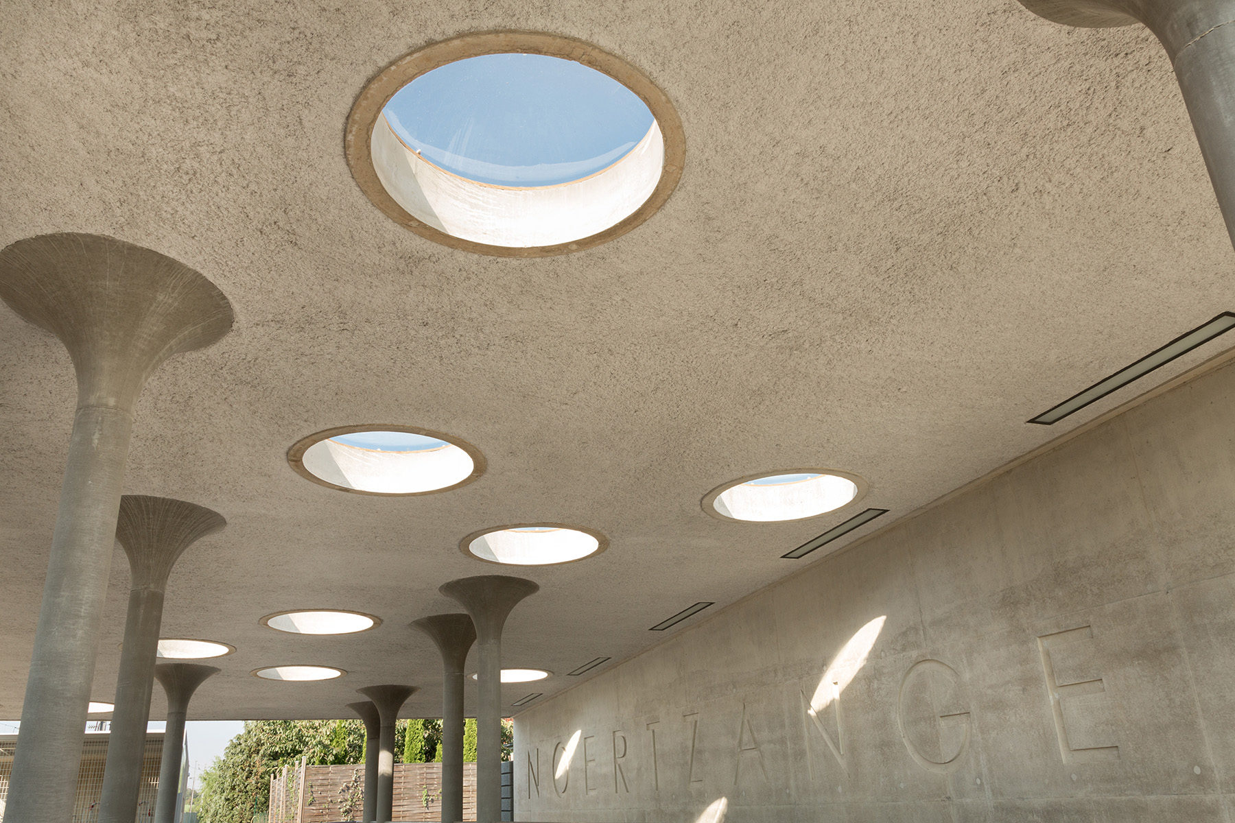 Le toit est supporté par des colonnes évasées en leur sommet donnant l’impression qu’elles sortent du toit pour donner naissance à une structure portante aux endroits nécessaires. Les colonnes sont disposées de façon asymétrique pour donner un certain rythme. Les puits de lumières dans le toit permettent à la lumière naturelle d’illuminer les rampes d’accès vers le passage souterrain. Les puits de lumière, l’éclairage partiel naturel et la forme évasée des colonnes font penser à une canopée.