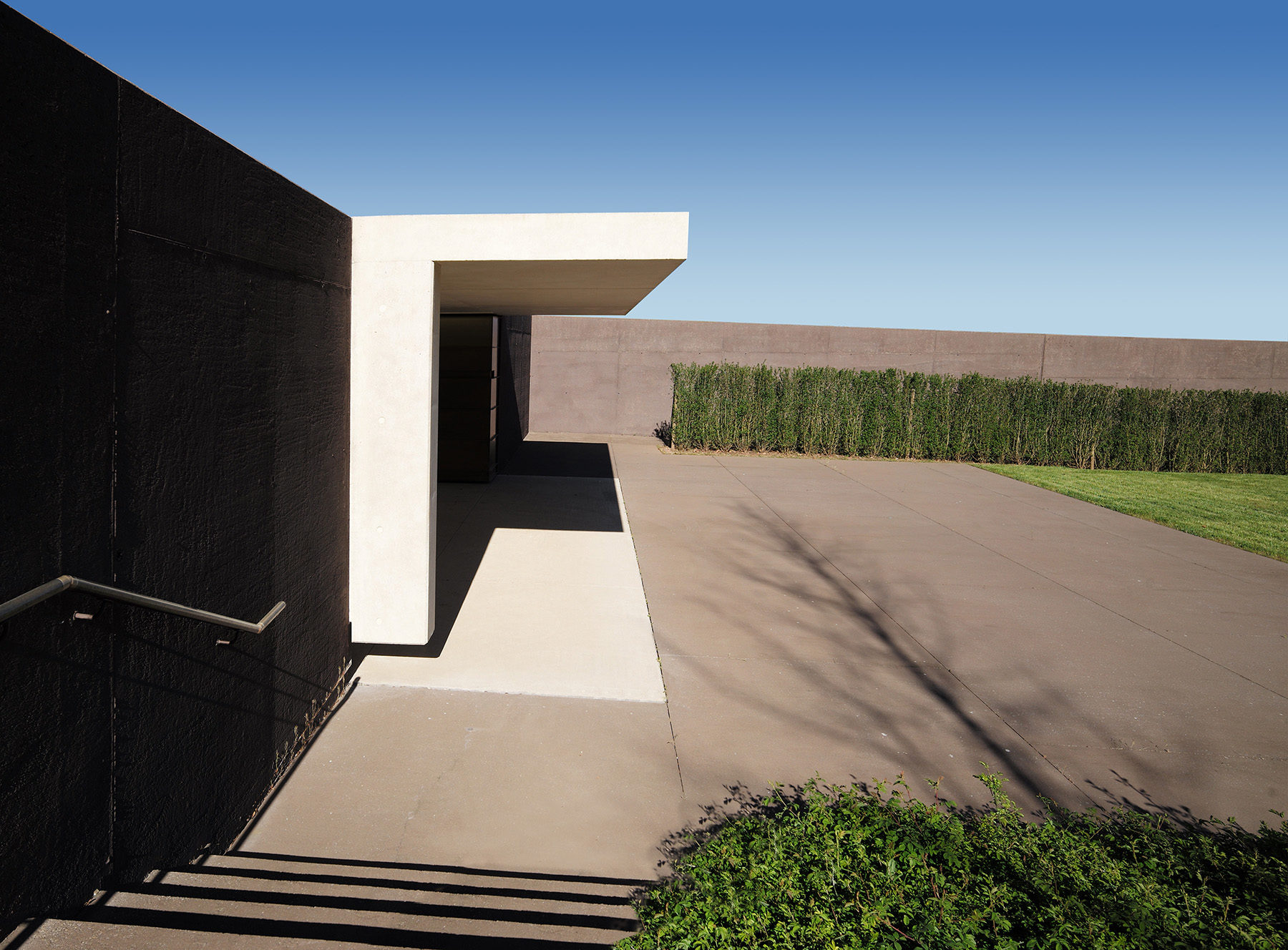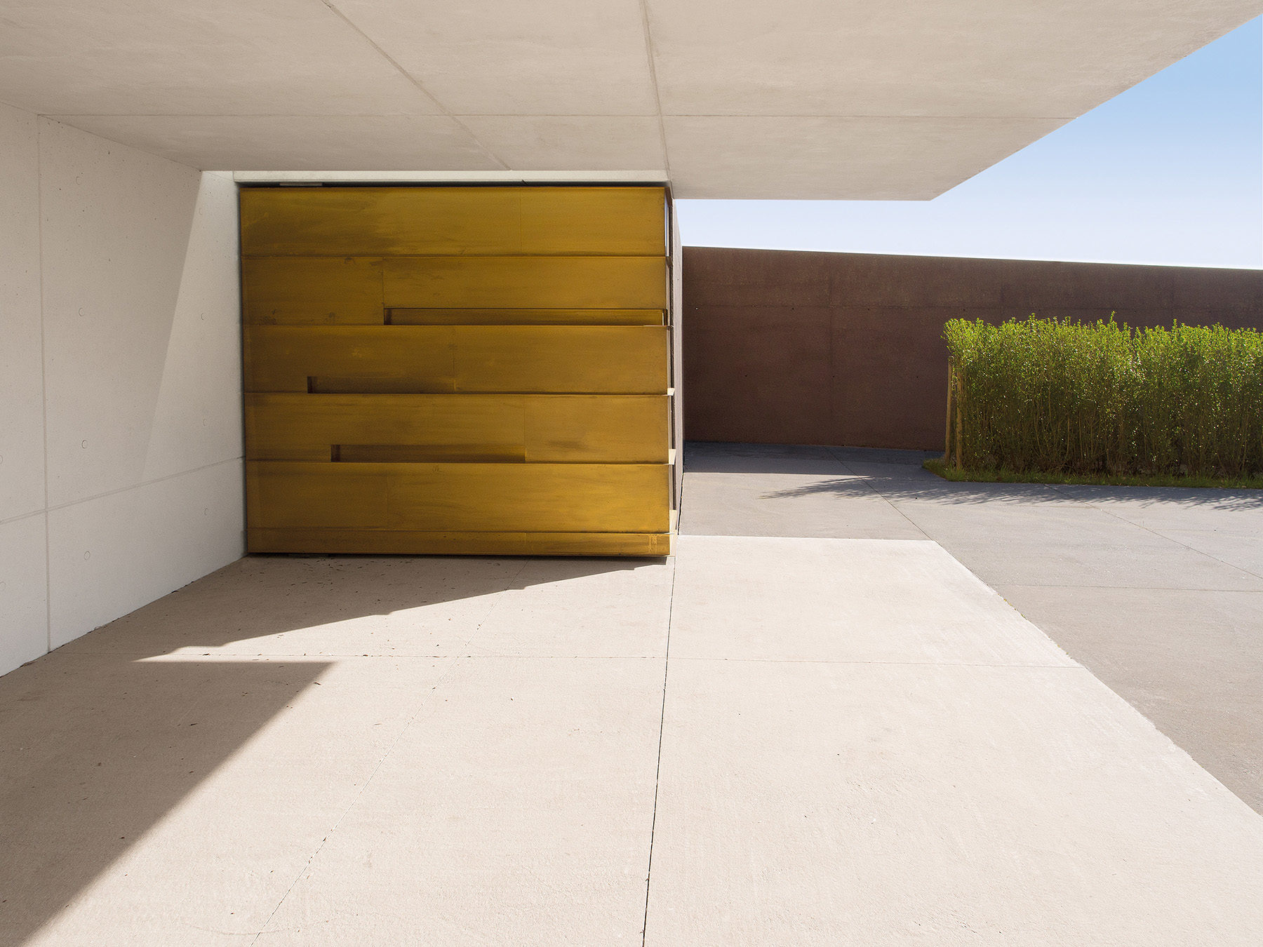 Deux chemins guident les visiteurs de l’entrée à travers le nouvel espace. Le „Weg des Abschieds“ – le chemin d’adieu – mène entre une haie haute et le mur longeant la rue vers la salle d’adieu et le grand parvis. A travers le „Weg der Stille“ – le chemin de la tranquillité – le visiteur peut joindre l’ancien cimetière ainsi que les nouvelles tombes d’urnes et les tombes d’enfants qui sont aménagées sur deux niveaux dans le versant planté de rosiers. La salle d’adieu est réalisée en béton vu blanc et lisse qui se distingue clairement des murs rugueux en béton teinté qui encadrent le nouveau cimetière. Au côté nord-ouest du cimetière est aménagé un pré fleuri et planté d’arbres qui fera office de cimetière boisé.