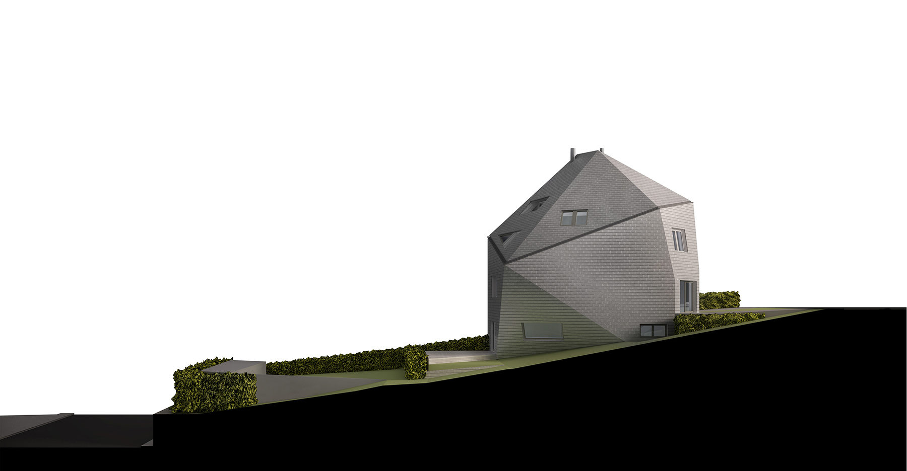 Perchée sur une colline du Luxembourg, au sein d’un tissu pavillonnaire plutôt traditionnel, la maison unifamiliale pour 4 personnes se démarque de ses voisins par certains aspects et se fond dans le paysage par d’autres. Sa volumétrie singulière, presque sculpturale, découle du gabarit réglementaire imposé par la ville de Luxembourg, mais ses proportions ne sont pas sans rappeler les résidences typiques de la région. Il s’agit presque d’une maison traditionnelle du Luxembourg dont on aurait coupé les coins et patché les ouvertures (d’après Frame/Mark Magazine).