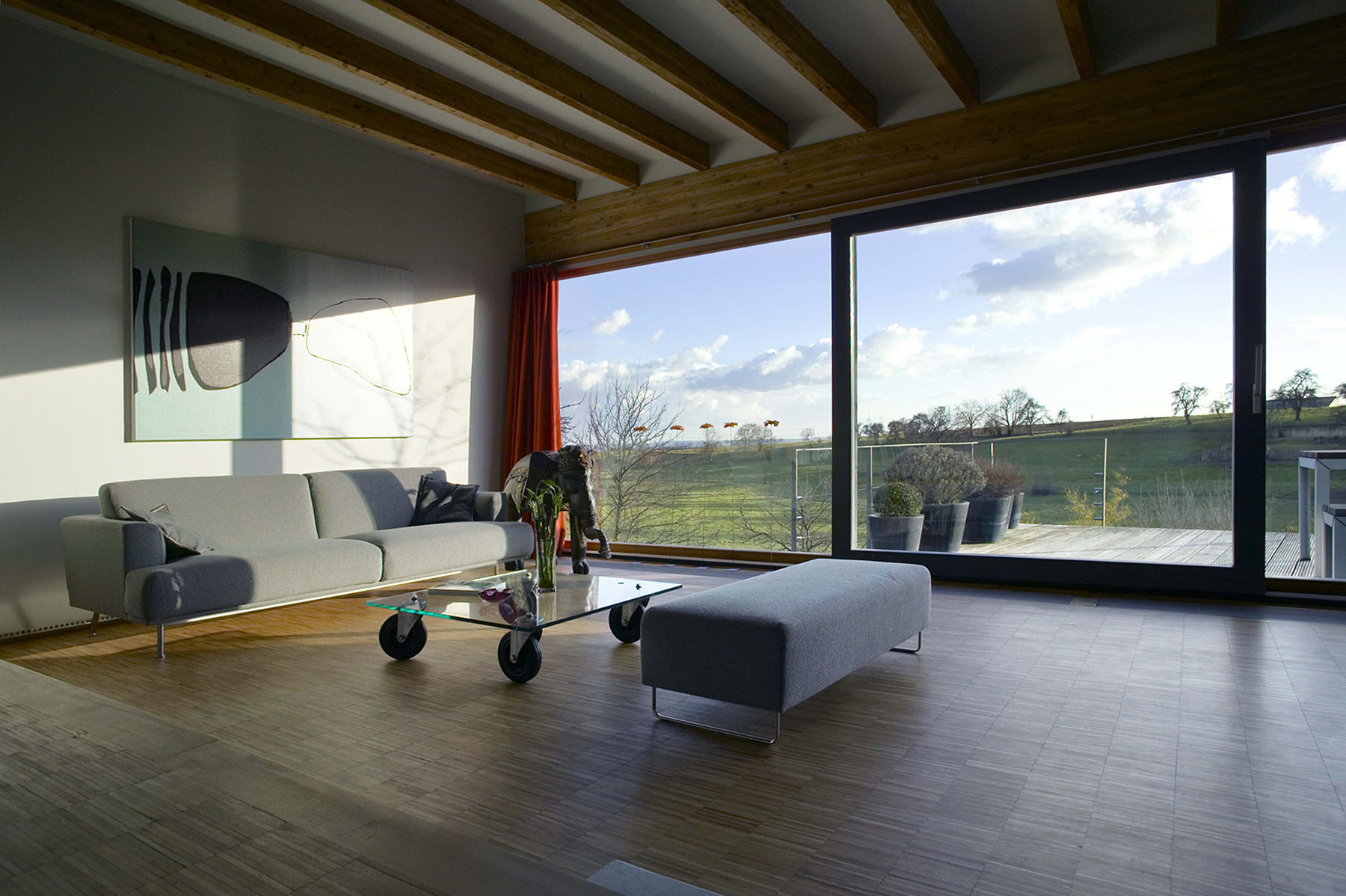 Les pièces de vie par contre occupent le côté Sud. Le séjour, la salle à manger et la cuisine sont ici rassemblés en une seule pièce, en surplomb du jardin, pour profiter au maximum du grand panorama sur le paysage.
