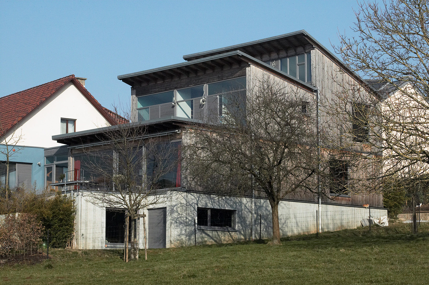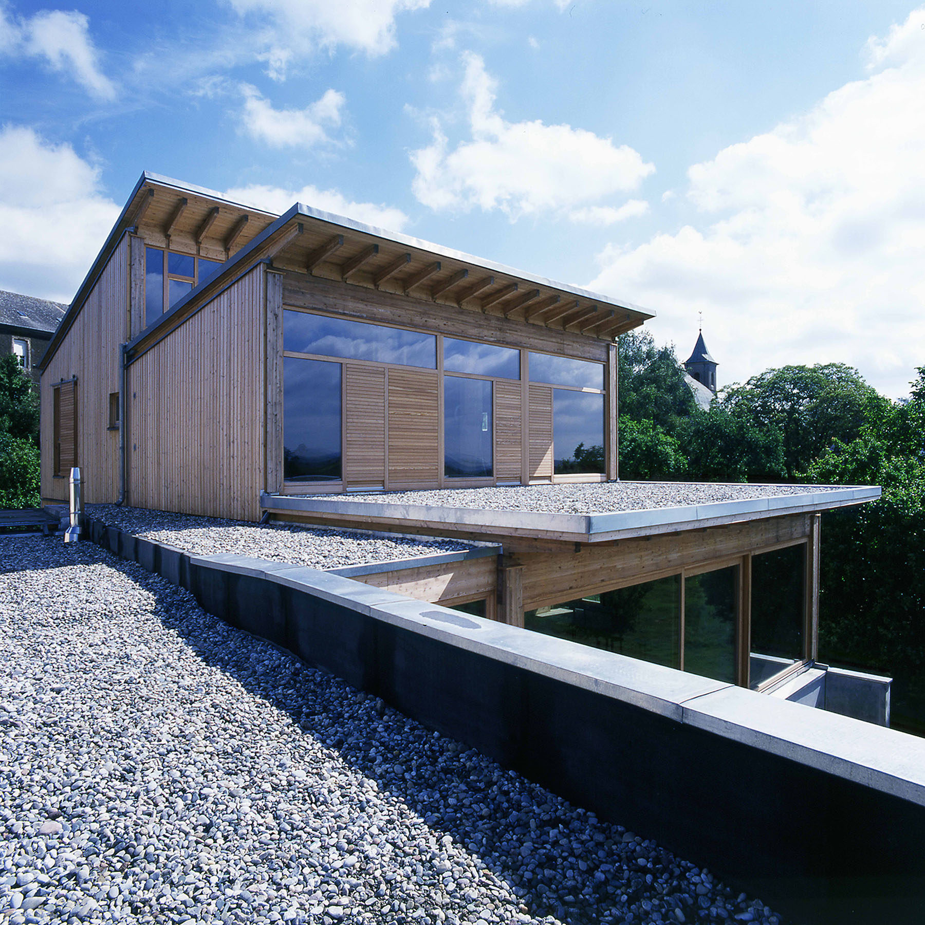 La forme orthogonale de la partie principale de l'habitation est complétée d'une annexe comportant les espaces servants : le garage, la buanderie et la réserve, qui épousent ainsi au mieux la forme trapézoïdale de la propriété. Cette maison est entièrement préfabriquée, depuis le soubassement en pré-murs de béton apparent isolés, en passant par les portiques en lamellé-collé franchissant la largeur du studio et permettant entre autres la vue panoramique de 9 mètres de large depuis le séjour, jusqu'aux parois de façades dont le bardage vertical permet l'intégration des joints sans affaiblir la lecture des strates horizontales du bâtiment.