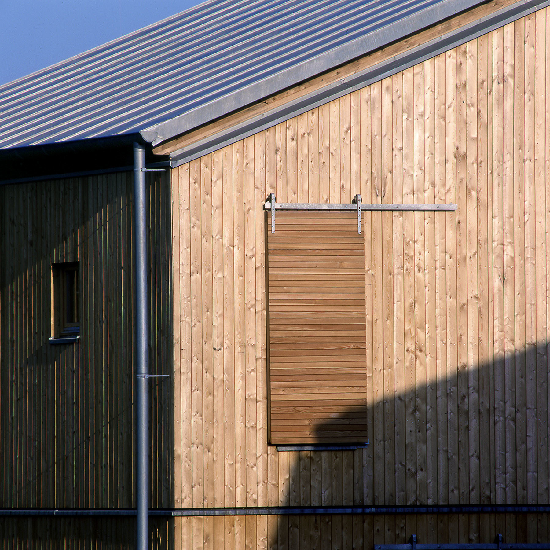 Le bardage extérieur en mélèze non-traité fait référence aux constructions rurales et, prenant une teinte gris argentée, fait à distance écho aux bâtiments massifs et aux toitures traditionnelles en ardoises présentes dans la silhouette du village.