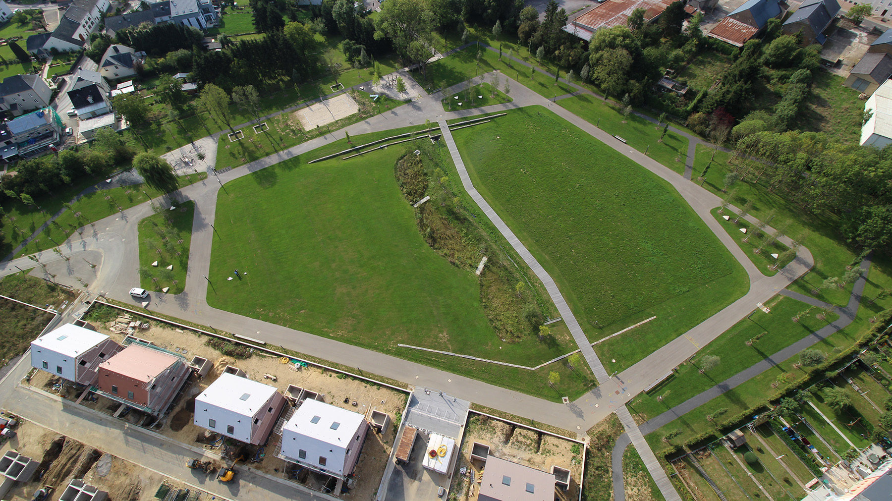 Les principaux éléments du parc, comme le pavillon du restaurant et la crèche, encore en cours de conception, sont situés le long du chemin de promenade. Un autre chemin traverse le parc, parallèlement à la partie ouverte du « Kaazebach ». Ce chemin a été conçu comme une passerelle en bois, et permet une connexion directe avec la « Cité Molter » située au centre de la commune. Le chemin de promenade circonscrit une pelouse vallonnée, dont les différentes hauteurs sont basées sur la topographie existante.