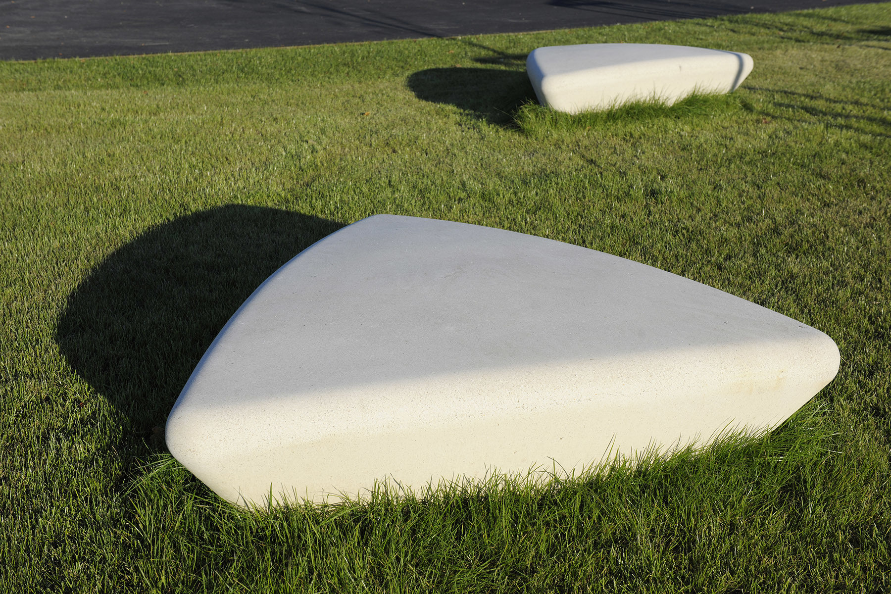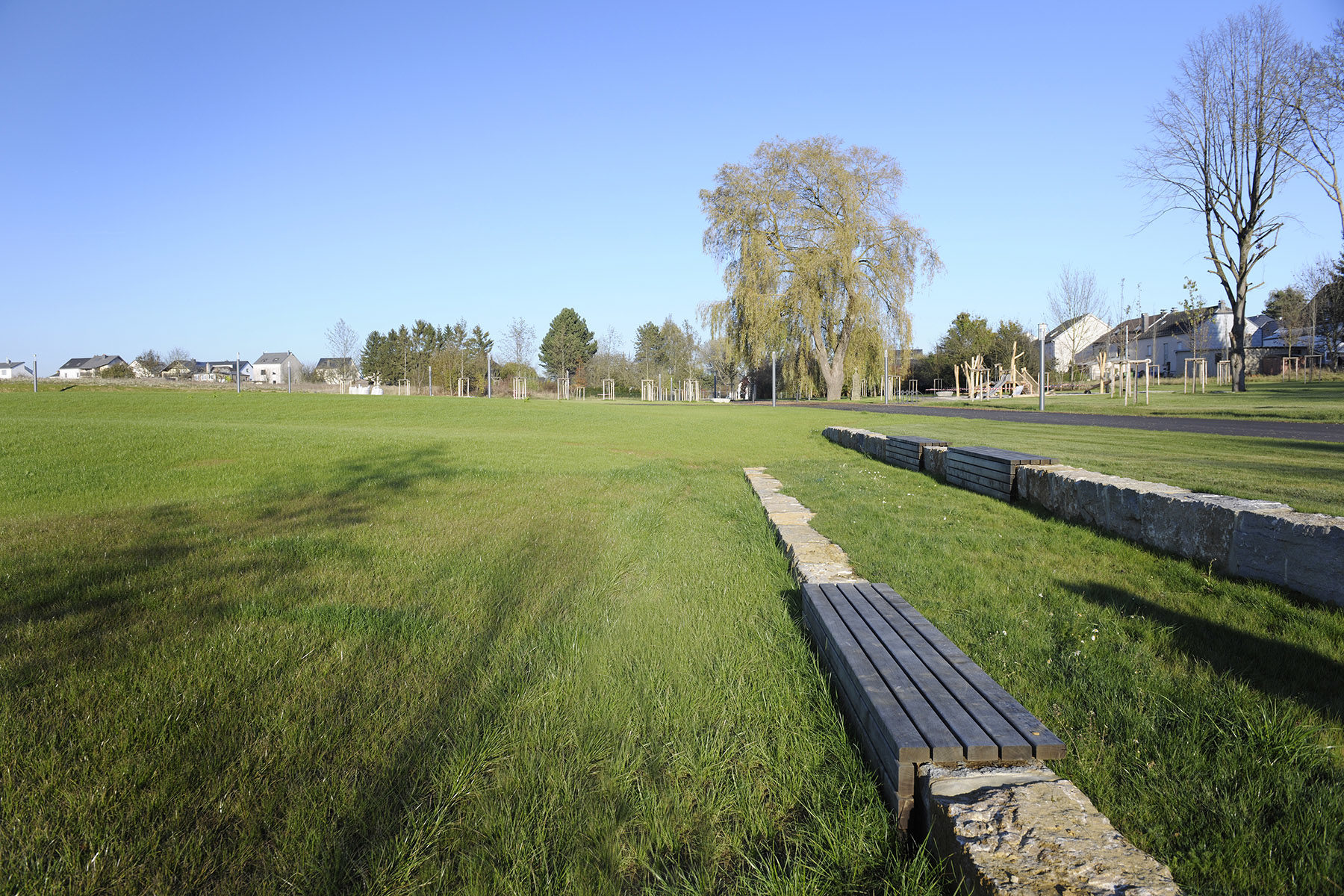 Les ondulations de la pelouse sont parallèles au « Kaazebach » et forment une sorte de sculpture du sol présentant des creux surélevés et plats sur lesquels il est possible de jouer ou de se reposer. Elles offrent ainsi des perspectives et des points de vue différents sur l’espace environnant selon l’endroit où l’on se place. Les deux extrémités des ondulations de la pelouse sont formées par des blocs de pierre naturelle, permettant d’une part de compenser la hauteur par rapport à la promenade, et d’autre part de stabiliser les pentes. De plus, ces blocs intègrent des sièges et constituent ainsi un espace de repos. À l’est du cours du ruisseau, une vaste surface de rétention est réservée pour la future zone résidentielle devant se situer au nord du parc. Une végétation humide permanente est plantée dans les bassins, lesquels sont temporairement remplis d’eau. Au contraire de la partie intérieure du parc, l’espace situé à l’extérieur du chemin de promenade est doté d’une végétation dense. Cette ceinture d’arbres doit par la suite entourer la zone de construction et former ainsi un espace tampon avec les jardins des propriétés adjacentes.
