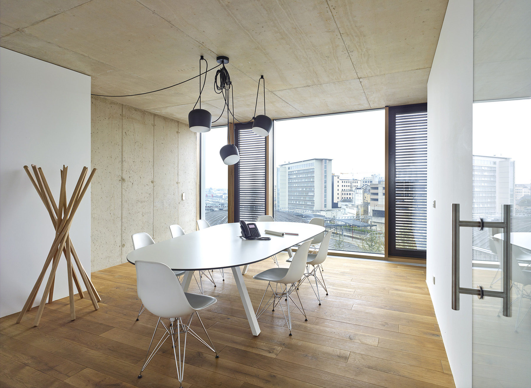 C’est un petit immeuble urbain passif (classe A) et « low-tech », avec une surface commerciale de 110m2 au rez-de-chaussée et cinq niveaux de bureaux de l’ordre de 125m2 chacun. Une structure de béton atypique, conçue avec Marc Ewen du bureau InCA, comportant des dalles à épaisseur variable, offre des surfaces à portée libre intérieures de 11×12m. Les allèges sont des poutres inversées, pour éviter les retombées de béton en façade, permettant aux fenêtres de toucher le plafond, pour maximiser l’entrée de lumière naturelle. La majorité des parois sont en pré-murs béton, laissés apparents. Les bétons des voiles et dalles coulés sur place, sans souhait particulier de finition, sont également restés apparents, avec leurs défauts et irrégularités. Des parquets de chêne massif apportent la chaleur et le fini noble qui apportent le contraste avec le gros-œuvre « brut de décoffrage ». L’escalier, balancé pour être le plus compact possible, est assez particulier : une grande tôle centrale en acier brut ciré de plus de 15m de haut est suspendue à la dalle de toiture, les marches en tôle pliée sont fixées aux voiles béton périphériques et à la tôle suspendue via des écarteurs qui laissent glisser la lumière le long des parois.