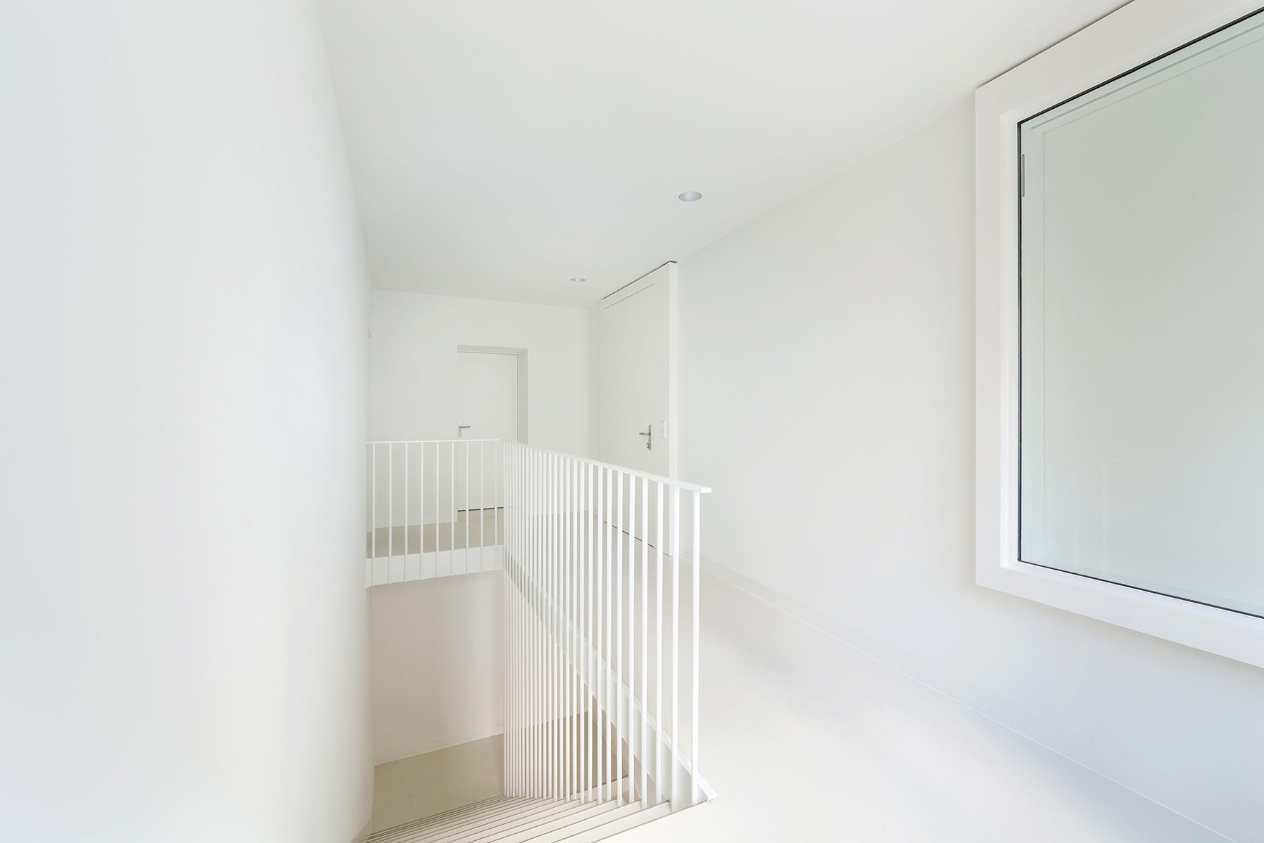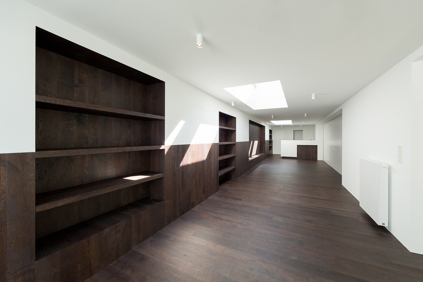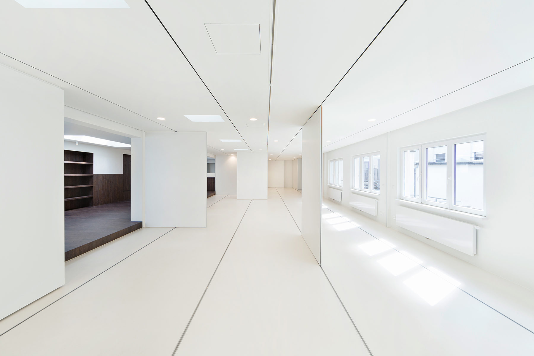 L’air est aspiré à l’intérieur des puits de lumière et il est soufflé latéralement par une grille placée en retrait vers le haut Le sol dans la grande pièce est fait en résine blanche. Cet univers blanc se retient volontairement au niveau des ambiances pour s’adapter facilement à toutes les fonctions d’utilisation possible.