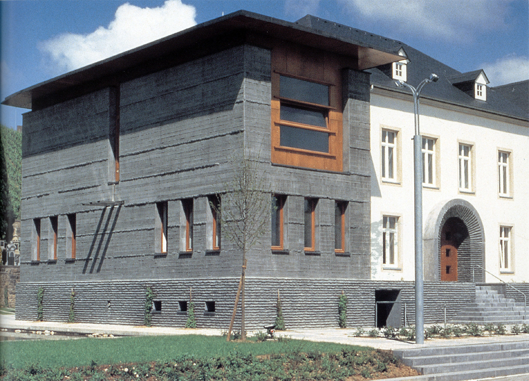 Parmi les constructions Hermann & Valentiny, la Maison Communale de Bech-Kleinmacher est l'exemple le plus frappant où formes et couleurs se détachent dans leur environnement.