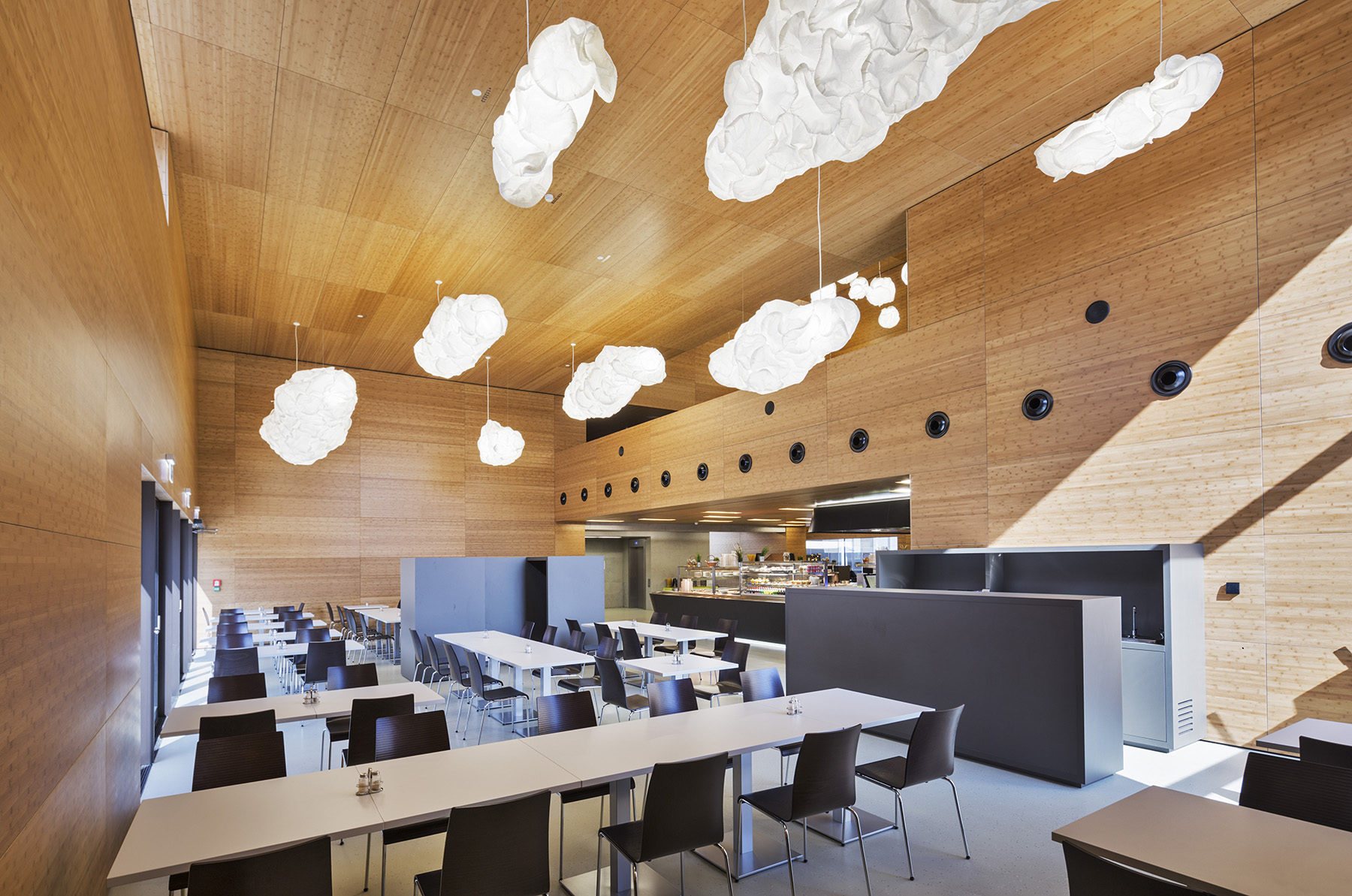 Based with its entrance zones on two concrete cores, the building opens up the dimensions of height and width. A subjective impression of floating is created by a concrete construction, cantilevered out from the cores from the second floor upwards. In terms of urban design, transparency from the “Place du Saint-Esprit” to the north all the way to the open spaces of the buildings of the library and the institutes to the south is achieved by simple means. The “Maison du Savoir” creates an urban context and continuum without relinquishing its solitary position in the process or, as Martin Heidegger once described it: “It is only the bridge that crosses the river which creates a place.” A place, that offers great qualities also on the inside. The “city within the city” becomes programmatic here, in actual fact lacking only the larger dimension. In response to the architects’ vision, the two-storey auditoriums float above the ground of the horizontal wing.